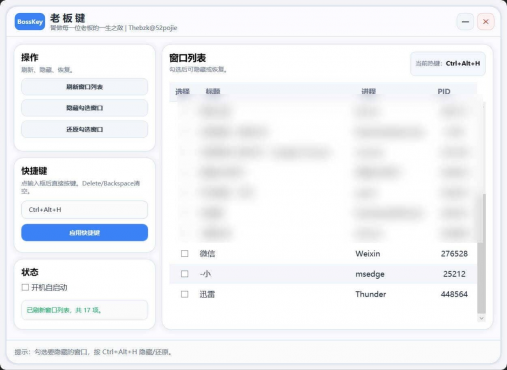 这是一款简洁实用的老板键工具,支持自定义热键、托盘运行与开机自启动,功能直接明了——一键隐藏当前桌面所有正在运行的窗口,有需要的朋友欢迎自取使用。